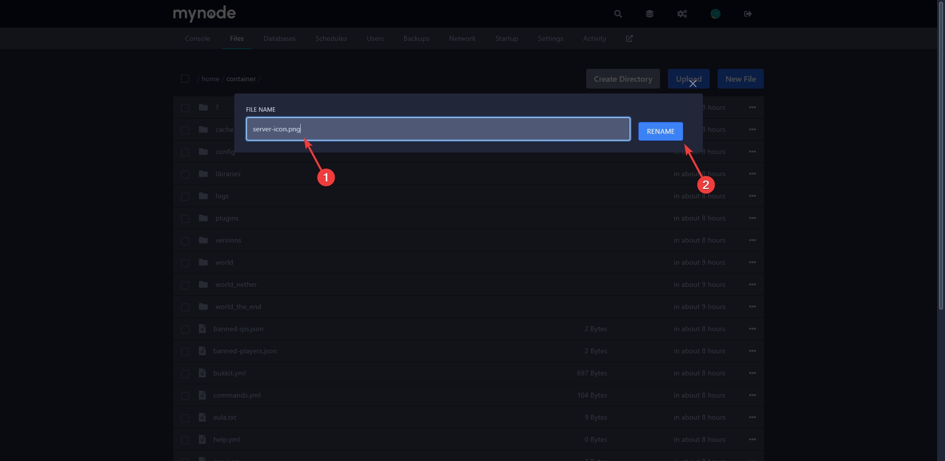 2) Ga naar de header en klik op de knop Files. Upload vervolgens het bestand en wijzig de naam naar "server-icon.png".